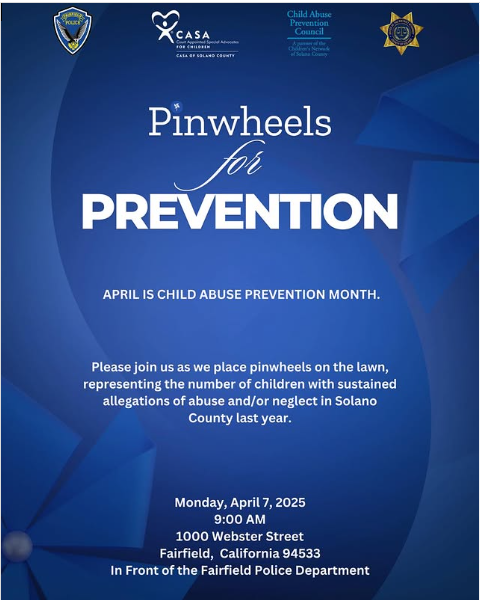 April is Child Abuse Prevention Month, and we invite you to join us in front of the department (1000 Webster Street) on Monday, April 7 at 9 am, for Pinwheels for Prevention. Following a word from our speakers, we will place pinwheels on the lawn. The pinwheels represent the number of children with sustained allegations of abuse and/or neglect in Solano County last year. CASA Solano, the Child Abuse Prevention Council, Fairfield Police Department, and Solano County DA’s Office have partnered for this year’s awareness event.